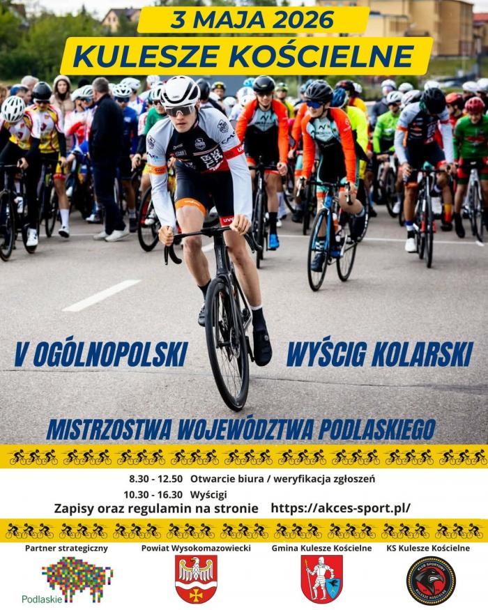 Już 3 maja 2026 roku Kulesze Kościelne ponownie staną się kolarskim sercem regionu. Tego dnia odbędzie się V Ogólnopolski Wyścig Kolarski o Puchar Starosty Powiatu Wysokomazowieckiego, połączony z Mistrzostwami Województwa Podlaskiego. Organizatorzy - KS Kulesze Kościelne oraz Podlaski Okręgowy Związek Kolarski - zapowiadają sportowe emocje na najwyższym poziomie i wydarzenie, które przyciągnie zawodników z całej Polski.