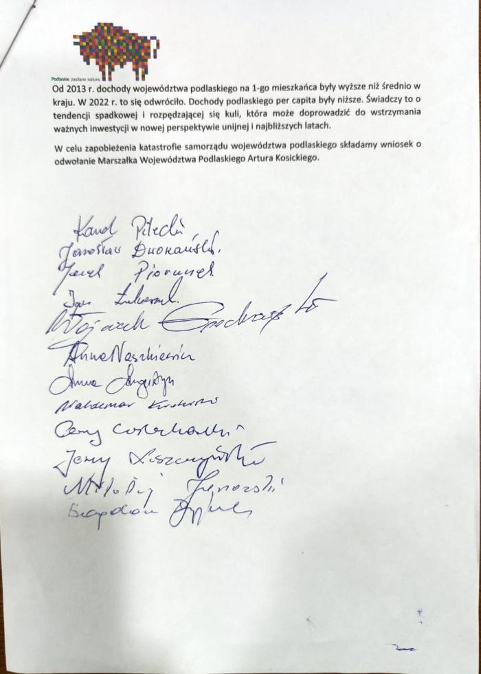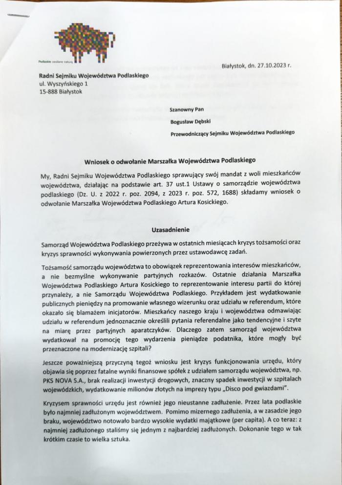 Poniżej zamieszczamy pełną treść wniosku o odwołanie Marszałka Województwa Podlaskiego Artura Kosickiego.