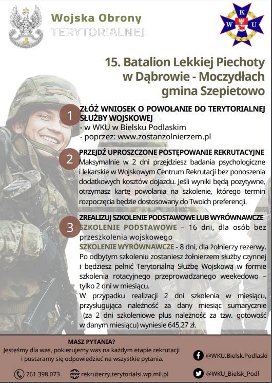 Jeszcze w tym roku rozpocznie się proces formowania nowego 15. batalionu lekkiej piechoty w Dąbrowie-Moczydłach. Od 1 marca br. uruchomiony zostanie punkt informacyjny dedykowany rekrutacji do 15.blp w budynku Urzędu Miasta Wysokie Mazowieckie przy ul. Ludowej 15 (pokój nr 22, II piętro) w każdy poniedziałek i środę w godzinach pracy UM, gdzie również będzie można „złożyć akces” do służby w nowym batalionie.