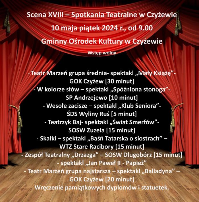 Od godz. 9:00 na scenie Gminnego Ośrodka Kultury w Czyżewie prezentować się będą aktorzy-amatorzy, którzy z gry czepią przede wszystkim przyjemność. W ramach Spotkań Teatralnych będzie można obejrzeć występy: