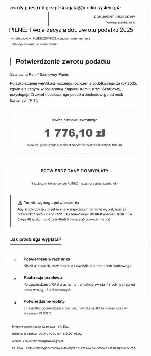 Do skrzynek trafiają wiadomości wyglądające jak oficjalna korespondencja z urzędu. Nadawca sugeruje powiązania z administracją publiczną, a w treści pojawia się informacja o rzekomej nadpłacie podatku. Odbiorca jest proszony o „potwierdzenie rachunku bankowego”, co – według treści wiadomości – ma przyspieszyć wypłatę pieniędzy.