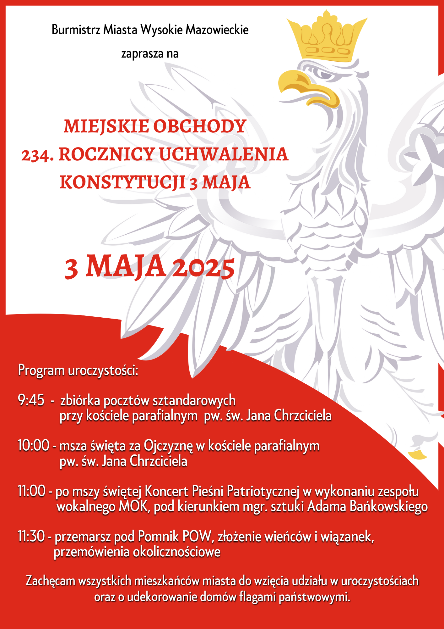 W sobotę, 3 maja obchodzić będziemy 234. rocznicę uchwalenia Konstytucji 3 Maja. Z tej okazji Burmistrz Miasta Wysokie Mazowieckie zaprasza na uroczyste miejskie obchody tej ważnej rocznicy.