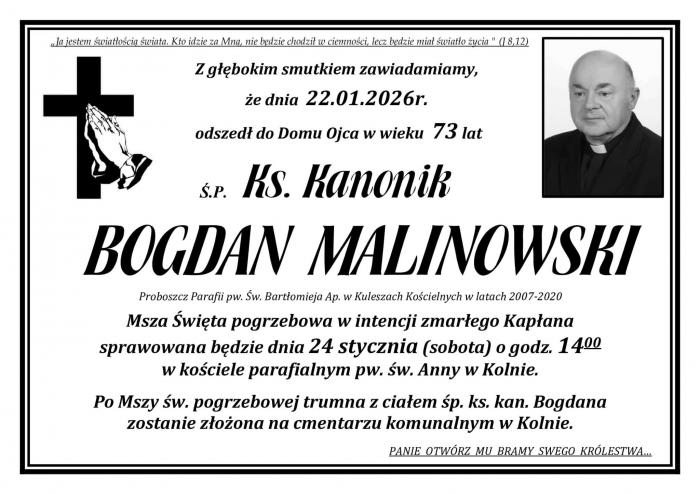 W czwartek, 22 stycznia 2026 roku, w wieku 74 lat zmarł ks. kanonik Bogdan Malinowski - emerytowany kapłan Diecezji Łomżyńskiej, wieloletni duszpasterz i były proboszcz parafii w Kuleszach Kościelnych. W kapłaństwie przeżył 49 lat.