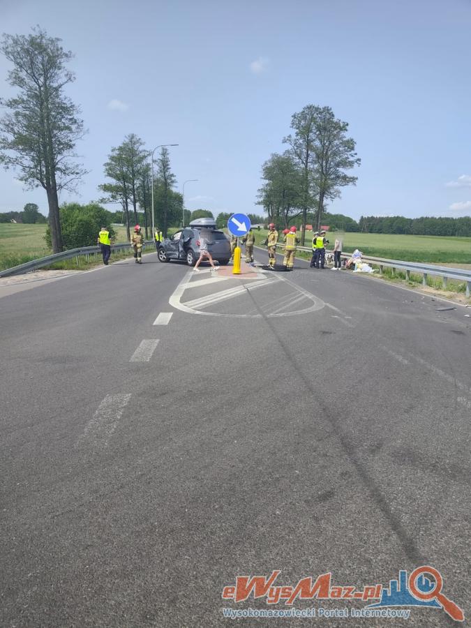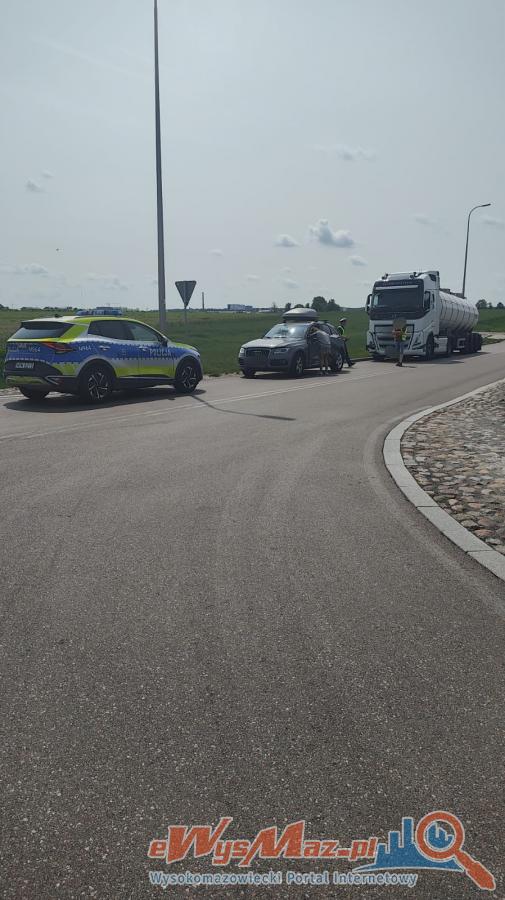 Galeria zdjęć przedstawiająca zdarzenie drogowe na drodze krajowej nr 66 w okolicy małej obwodnicy Wysokiego Mazowieckiego. Na zdjęciach widoczne są zderzone samochody ciężarowy i osobowy audi, a także miejscowy patrol policji. Dzięki szybkiej interwencji funkcjonariuszy nikt nie odniósł poważniejszych obrażeń, oba zaangażowane pojazdy były sprawne. Policja prowadzi szczegółowe dochodzenie w tej sprawie.