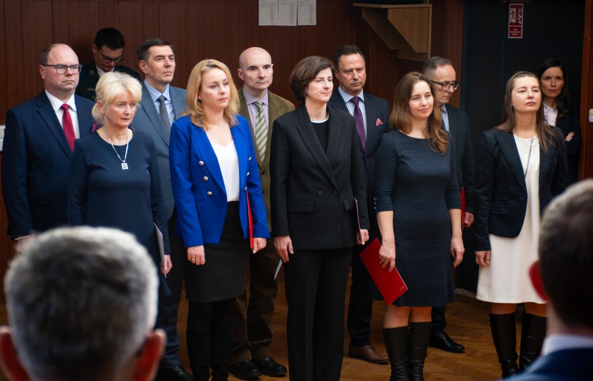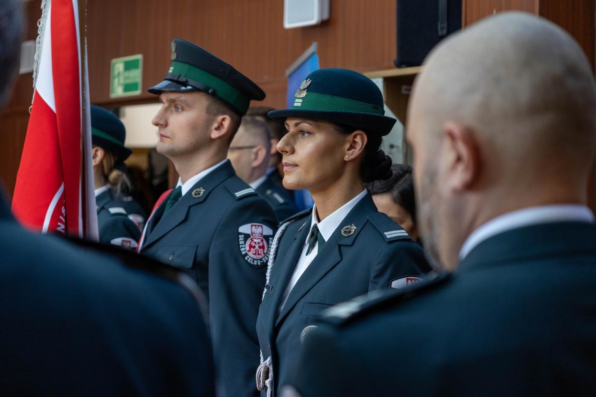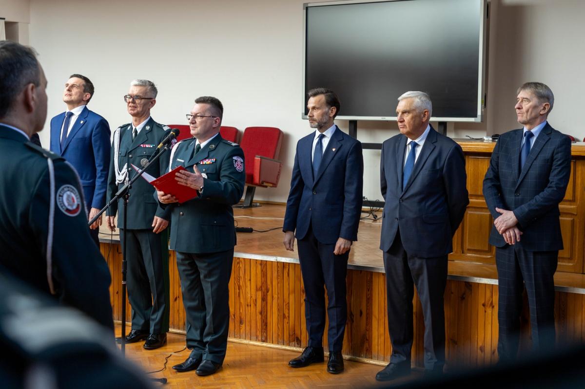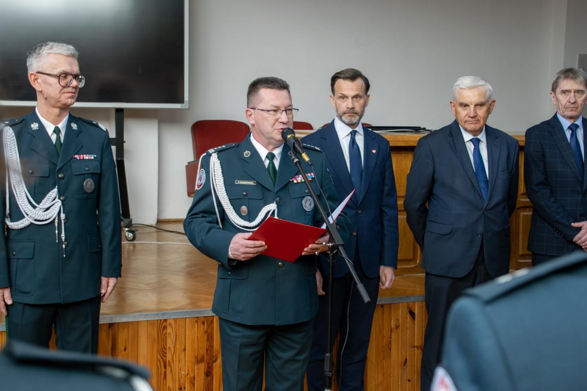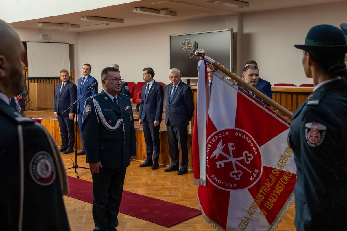 Galeria zdjęć z uroczystości wręczenia odznaczeń i awansów dla funkcjonariuszy KAS w Białymstoku. Zdjęcia ukazują moment wręczenia wyróżnień, ślubowanie nowych funkcjonariuszy, oraz wystąpienie Dyrektora Izby Administracji Skarbowej. Wydarzenie celebrowało wkład pracowników w rozwój administracji skarbowej, podkreślając ich misję na rzecz państwa i obywateli.