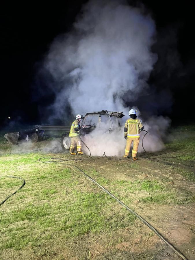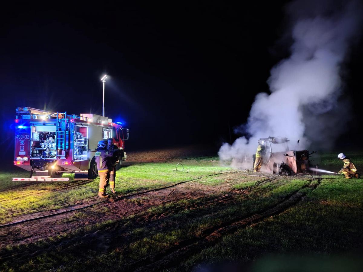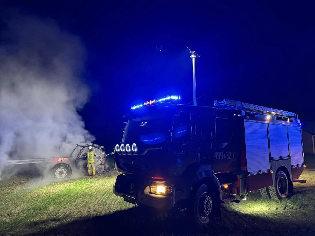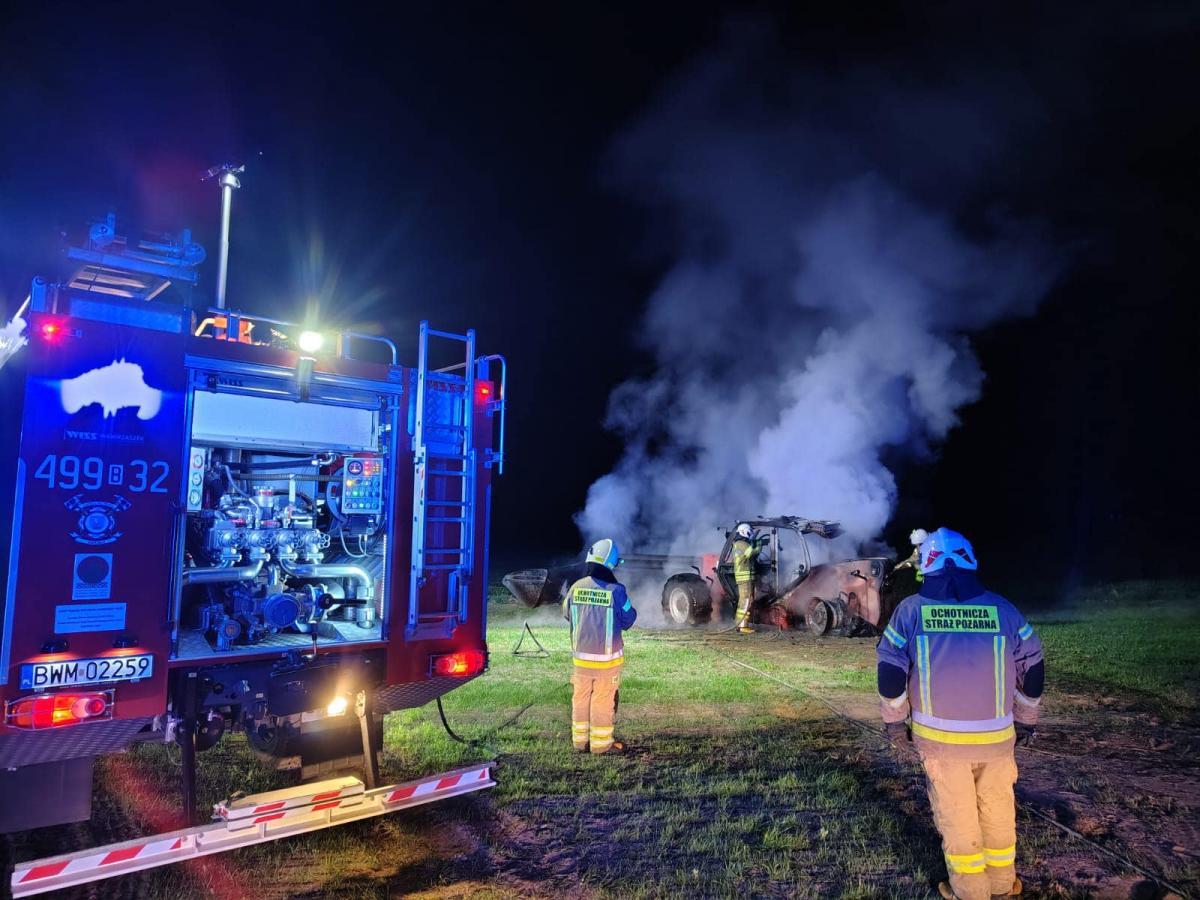 Na zdjęciach z akcji gaśniczej w miejscowości Czajki widać strażaków zabezpieczających teren i gaszących płonącą ładowarkę teleskopową. Akcja miała miejsce po pożarze maszyny rolniczej, która całkowicie spłonęła. Dzięki szybkiej interwencji zespołów z JRG Wysokie Mazowieckie i OSP KSRG Sokoły nikomu nic się nie stało. Oddziałowe zdjęcia przekazane zostały przez OSP KSRG Sokoły.