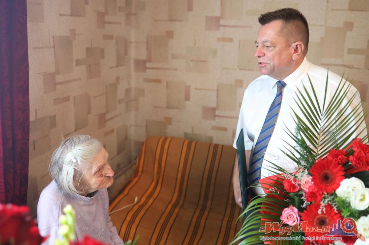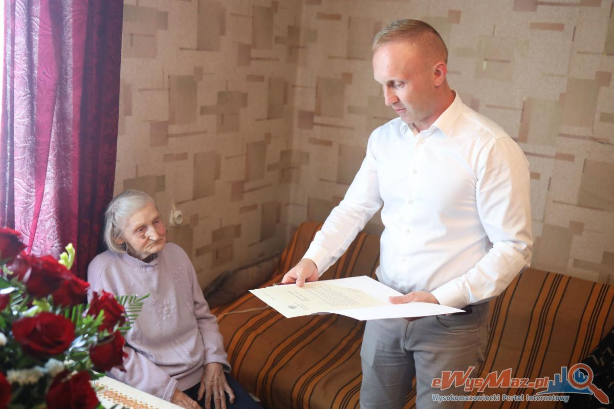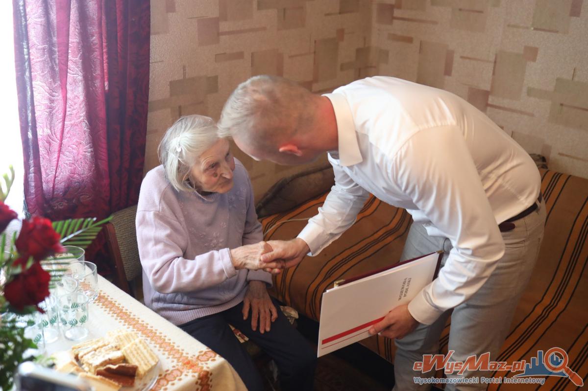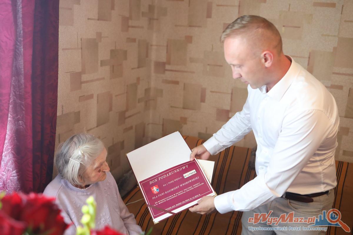 Galeria zdjęć z uroczystości setnych urodzin Pani Kazimiery Wnorowskiej z wsi Wnory-Pażochy. Niezwykłe spotkanie z wójtem, urzędnikami oraz bliskimi, pełne życzeń, kwiatów i miłych gestów. Jubilatka otrzymuje bon na węgiel od gminy, przekaz dodatku do emerytury oraz życzenia od Premiera. Radość i wzruszenie na twarzy sto latki, która mimo trudów życiowych cieszy się z urodzin w otoczeniu swoich najbliższych i społeczności lokalnej.