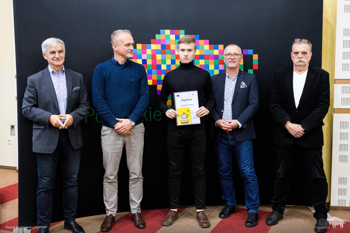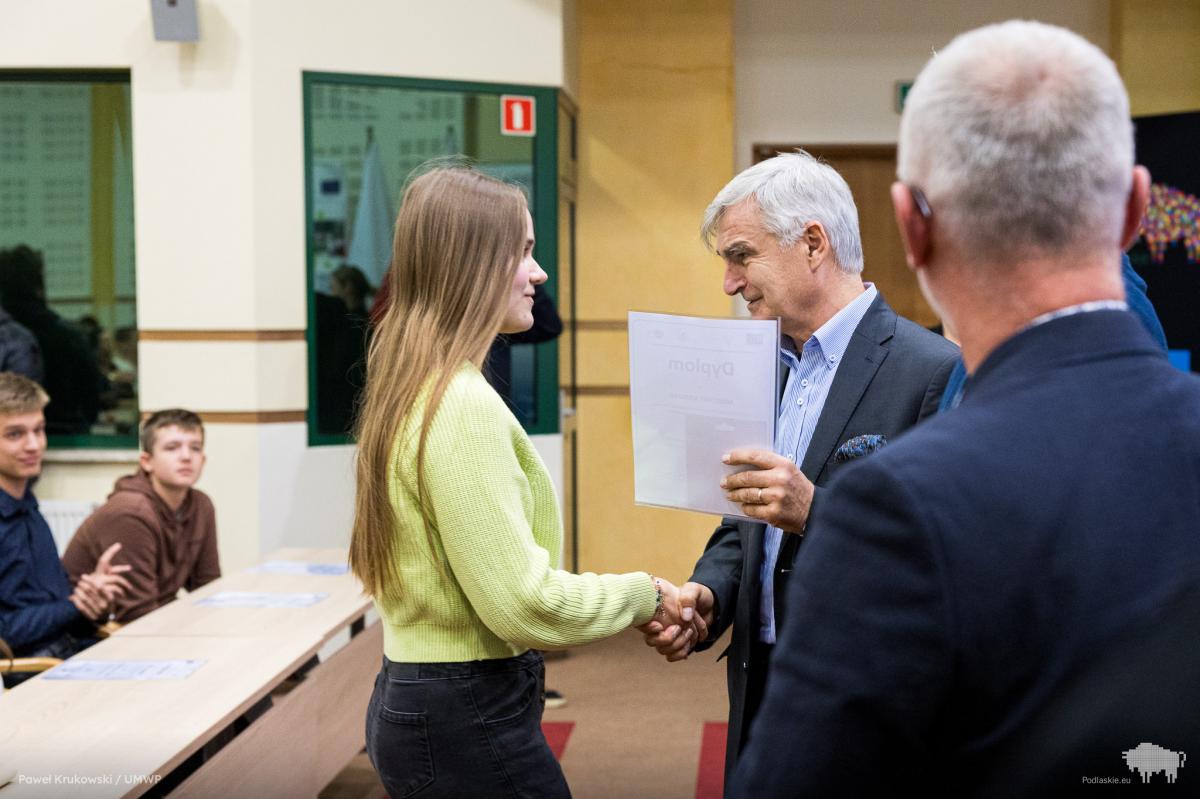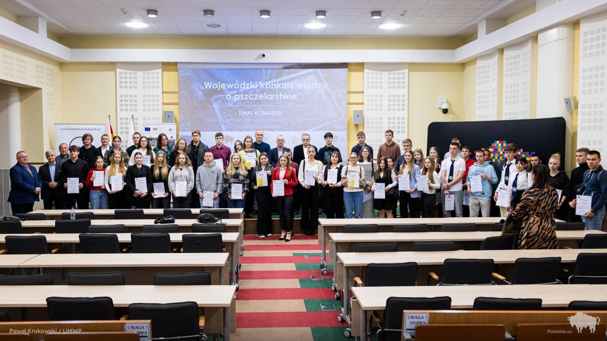 Galeria zdjęć z VII edycji Wojewódzkiego Konkursu Wiedzy o Pszczelarstwie w Białymstoku. Uczniowie prezentujący swoją wiedzę oraz szczęśliwi laureaci. Radość zwycięstwa na twarzach Martyny Mendak, Michała Gumieniaka oraz Oliwii Śmiarowskiej. Komisja oceniająca prace i nagradzający uczestnicy, a także mobilizujące wyróżnienia dla Mateusza Gutowskiego, Bartosza Gajewskiego i Agaty Kryńskiej. Emocje, zaangażowanie i pasja pszczelarstwa w pełnej krasie! #Pszczelarstwo #KonkursWiedzy #EdukacjaRolnicza