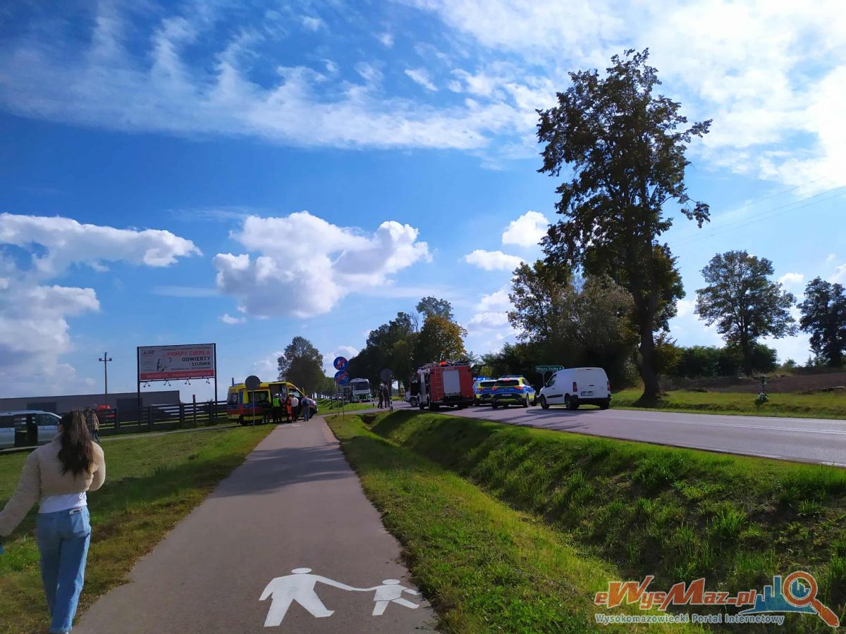 Galeria zdjeć z zdarzenia drogowego na skrzyżowaniu w Dąbrówce Kościelnej ukazuje interwencję wysokomazowieckich służb. Na zdjęciach widać strażaków przy dwóch zderzonych samochodach, które podróżowały czterema osobami. Działania ratownicze skupiły się na zabezpieczeniu terenu, odłączeniu prądu i kontrolowaniu wycieków. Zeznania kpt. Zalewskiego informują, że ruch na DK66 był zatrzymany. Dwie osoby zostały przetransportowane do szpitala.