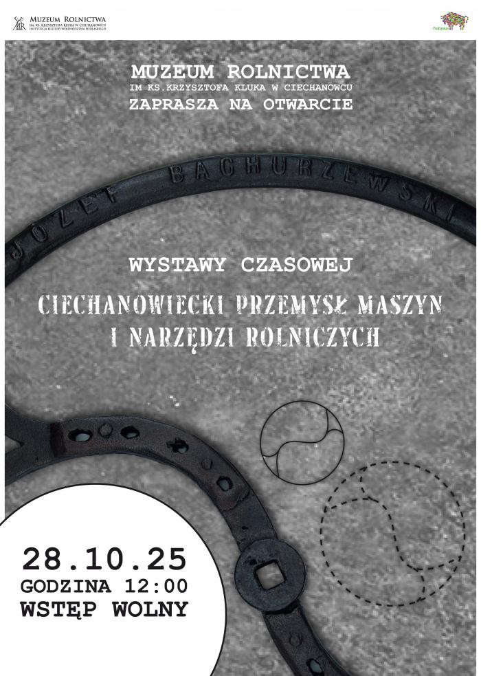 Łukasz Prokorym Marszałek Województwa Podlaskiego oraz Dorota Łapiak Dyrektor Muzeum Rolnictwa im. ks. Krzysztofa Kluka w Ciechanowcu zapraszają na otwarcie wystawy "Ciechanowiecki Przemysł Maszyn i Narzędzi Rolniczych". Uroczystość będzie miała miejsce 28 października 2025 roku (wtorek) o godzinie 12:00 w siedzibie Muzeum Rolnictwa w Ciechanowcu przy ul. Pałacowej 5.