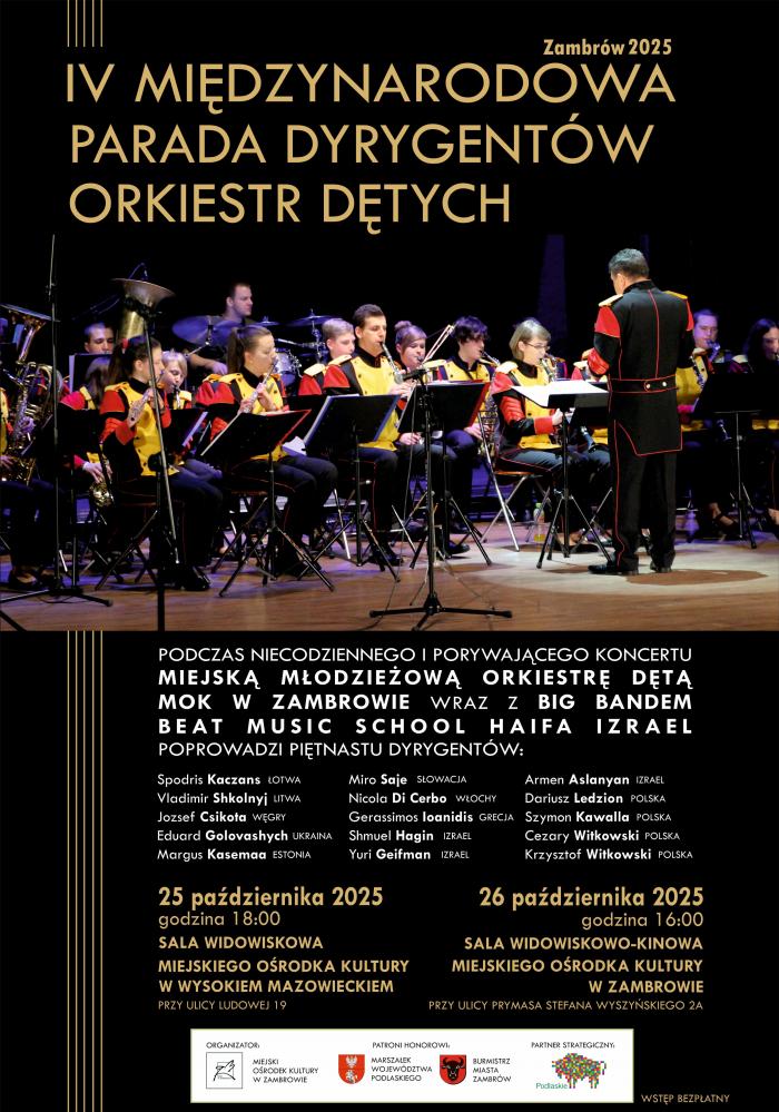 Miejski Ośrodek Kultury w Zambrowie zaprasza na koncerty w ramach IV Międzynarodowej Parady Dyrygentów Orkiestr Dętych, która odbędzie się 25 i 26 października 2025 roku w Wysokiem Mazowieckiem i Zambrowie.