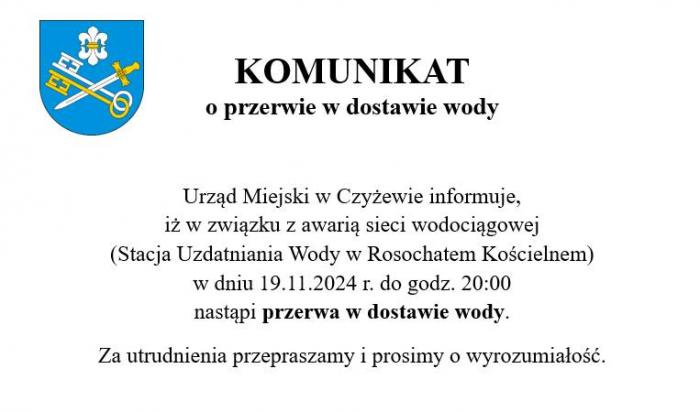 Urząd Miejski w Czyżewie informuje, iż w związku z wystąpieniem awarii sieci wodociągowej - Stacja Uzdatniania Wody w Rosochatem Kościelnem - w dniu 19.11.2024 r. (wtorek) do godz. 20:00 nastąpi przerwa w dostawie wody.