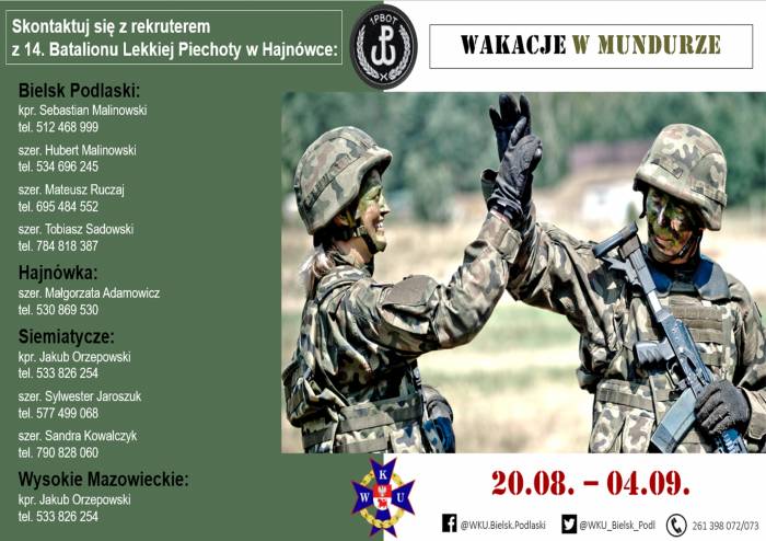 Wojskowa Komenda Uzupełnień w Bielsku Podlaskim oraz 14. Batalion Lekkiej Piechoty w Hajnówce zapraszają do odbycia szkolenia wojskowego w ramach terytorialnej służby wojskowej.