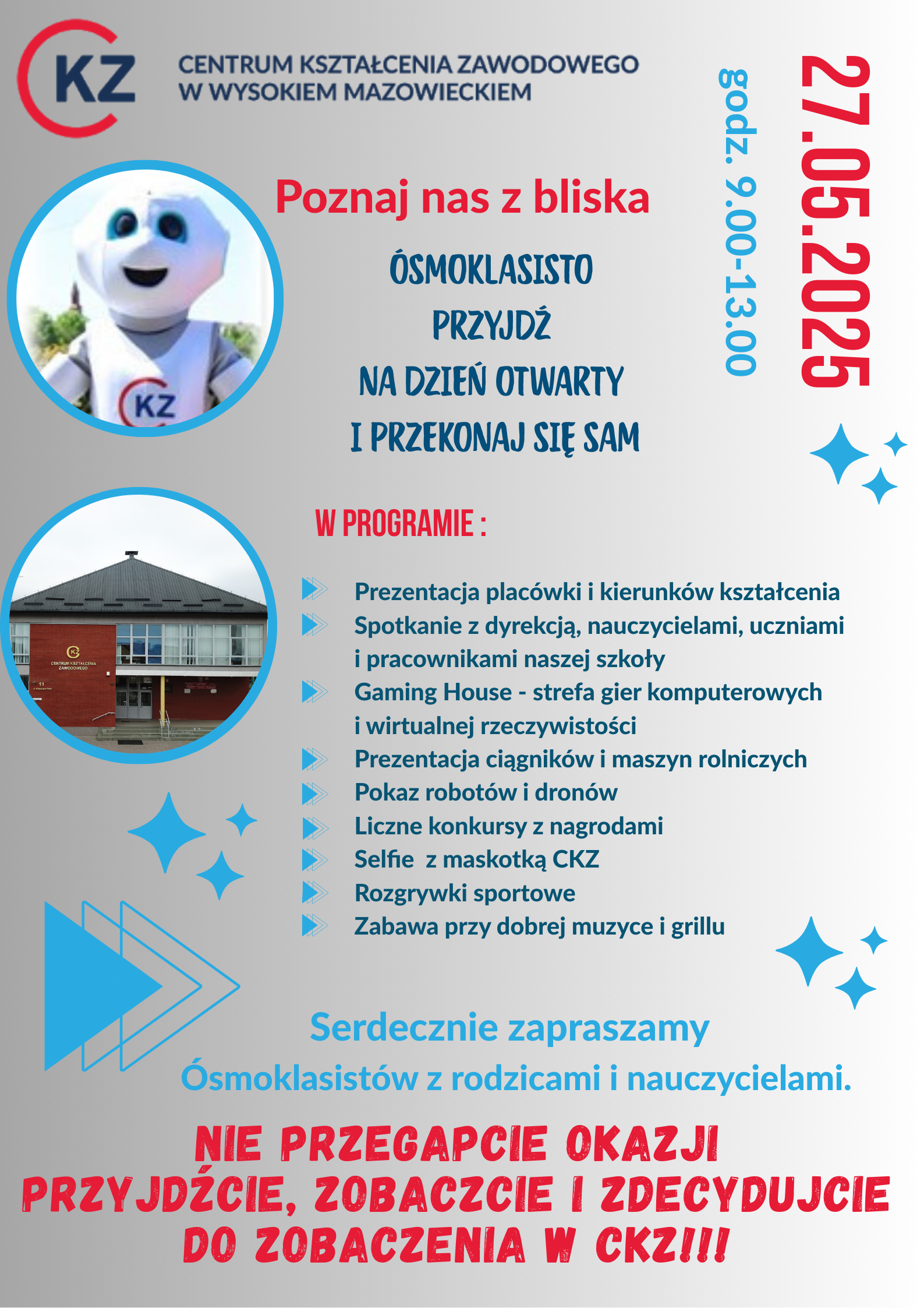 Centrum Kształcenia Zawodowego w Wysokiem Mazowieckiem zaprasza ósmoklasistów, ich rodziców i nauczycieli na Dzień Otwarty, który odbędzie się 27 maja 2025 r. To doskonała okazja, by poznać ofertę szkoły.