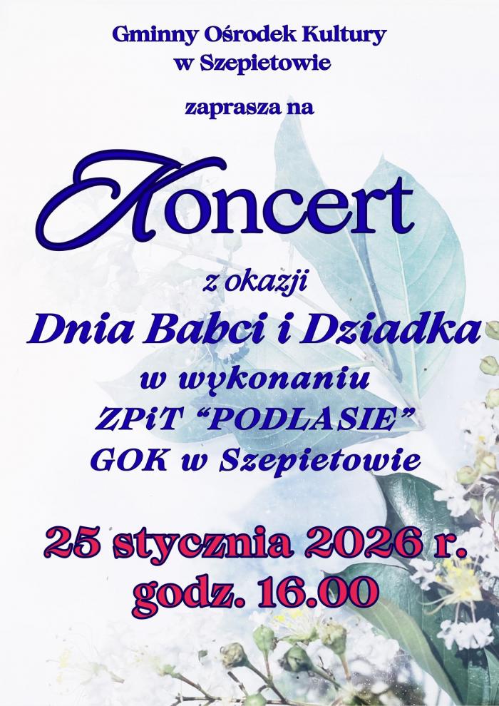 Gminny Ośrodek Kultury w Szepietowie zaprasza mieszkańców gminy i okolic na wyjątkowy koncert z okazji Dnia Babci i Dziadka, który odbędzie się w sobotę, 25 stycznia o godzinie 16:00.