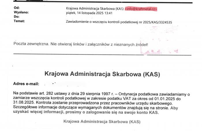 Pamiętaj: KAS nie informuje o zamiarze wszczęcia kontroli podatkowej w ten sposób.