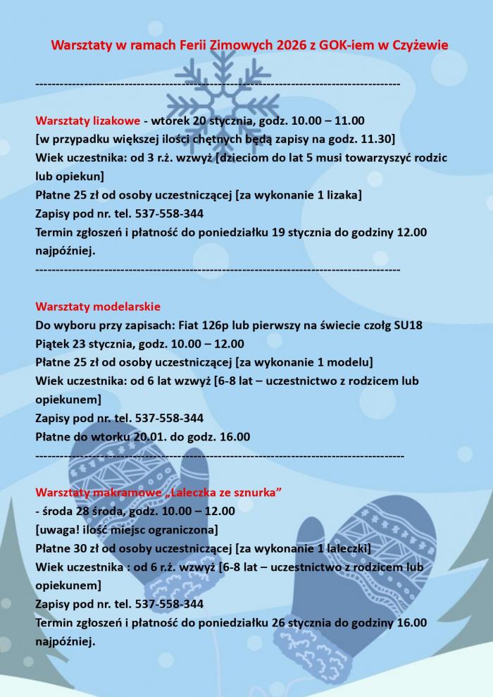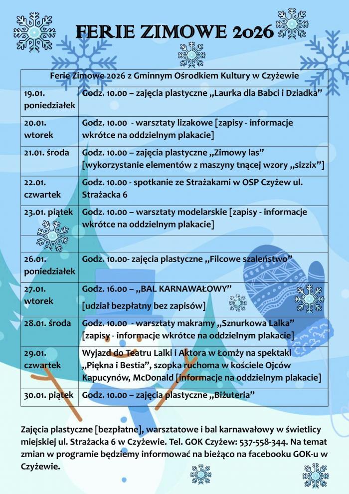 Gminny Ośrodek Kultury w Czyżewie przygotował bogatą i zróżnicowaną ofertę zajęć na ferie zimowe 2026.