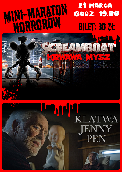 Już jutro, 21 marca kino WARS w Wysokiem Mazowieckiem zaprasza na mini-maraton horrorów. Start o godz. 19:00. Do obejrzenia będą dwie pozycje: "SCREAMBOAT. KRWAWA MYSZ" oraz "KLĄTWA JENNY PEN".