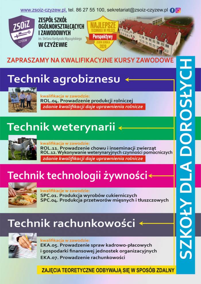 Zespół Szkół Ogólnokształcących i Zawodowych w Czyżewie zaprasza na Kwalifikacyjne Kursy Zawodowe. Nauka trwa 3 semestry i jest bezpłatna. Zajęcia teoretyczne są prowadzone w formie zdalnej, a praktyczne - stacjonarnej. Po zakończeniu nauki jest egzamin państwowy organizowany przez OKE Łomża, składający się z części pisemnej i praktycznej.