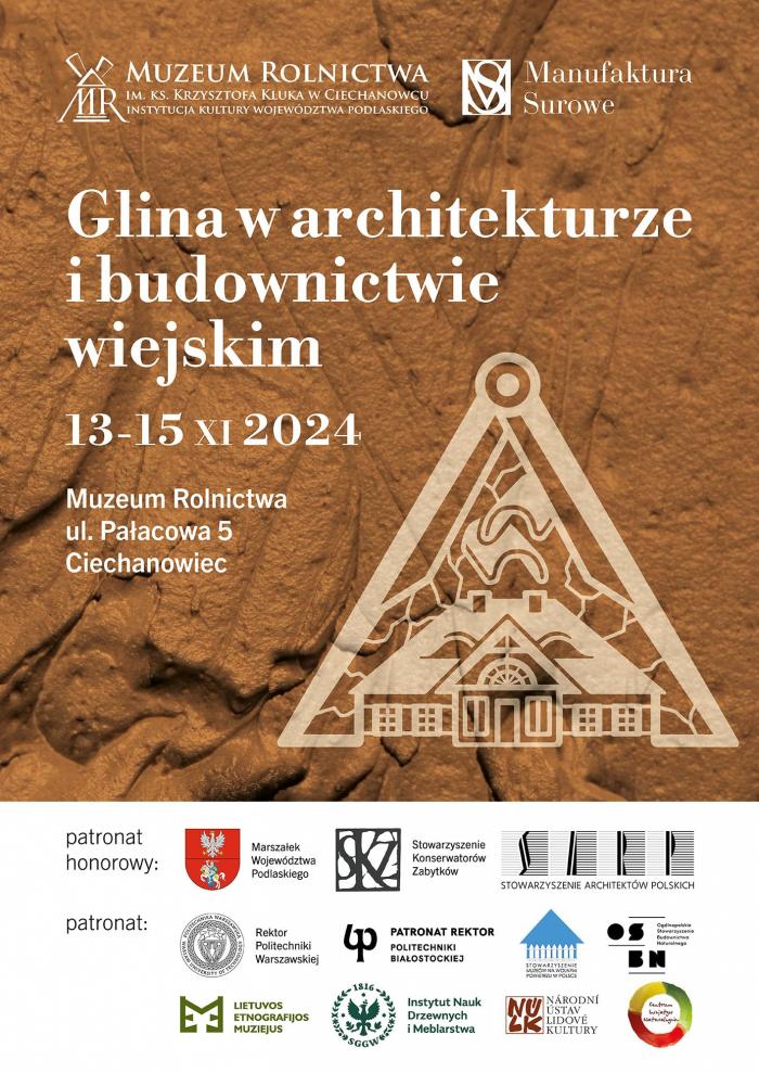 Coraz więcej architektów i inżynierów zwraca uwagę na potencjał materiałów glinianych. Łącząc przeszłość z przyszłością w świecie budownictwa naturalnego zapraszamy serdecznie na międzynarodową konferencję "Glina w architekturze i budownictwie wiejskim", którą organizuje Muzeum Rolnictwa im. ks. Krzysztofa Kluka w Ciechanowcu i Manufaktura Surowe sp. z o.o. w dniach 13-15 listopada 2024 r. w Ciechanowcu.