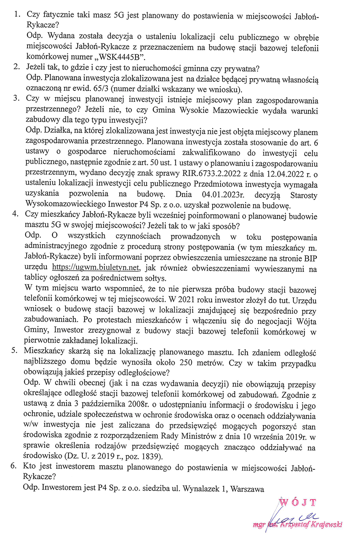 Poniżej publikujemy odpowiedź Wójta Gminy Wysokie Mazowieckie Krzysztofa Krajewskiego w sprawie budowy masztu 5G w miejscowości Jabłoń-Rykacze.