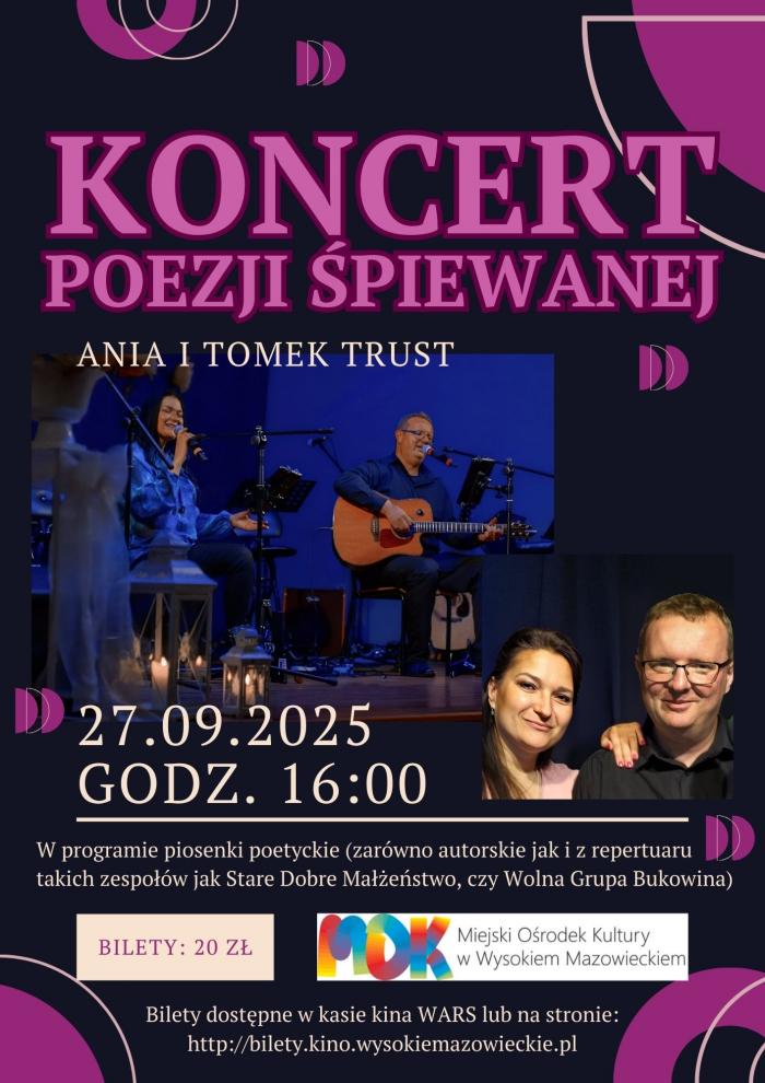 Miejski Ośrodek Kultury w Wysokiem Mazowieckiem zaprasza na niezwykły muzyczny wieczór, który przeniesie publiczność w świat lirycznych opowieści i nastrojowych melodii. 27 września (sobota) o godz. 16:00 w sali widowiskowo-kinowej odbędzie się koncert poezji śpiewanej w wykonaniu duetu Ani i Tomka Trust.