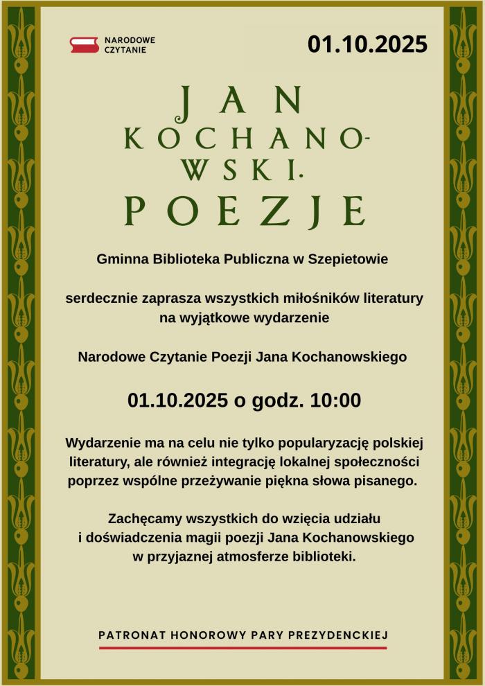 Gminna Biblioteka Publiczna w Szepietowie zaprasza mieszkańców na Narodowe Czytanie Poezji Jana Kochanowskiego, które odbędzie się 1 października 2025 roku (środa) w godzinach 10:00 w holu Gminnego Ośrodka Kultury w Szepietowie.