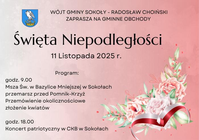 Gminne obchody Święta Niepodległości w Sokołach odbędą się według następującego porządku: