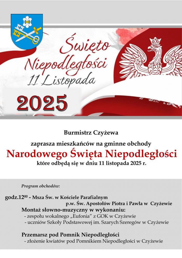 W Czyżewie uroczystości rozpocznie msza św. w kościele pw. św. Ap. Piotra i Pawła o godz. 12:00. Po liturgii będzie można obejrzeć montaż słowno-muzyczny w wykonaniu Zespołu Wokalnego EUFONIA oraz uczniów SP w Czyżewie. Następnie zebrani przejdą pod Pomnik Niepodległości, gdzie złożone zostaną kwiaty.