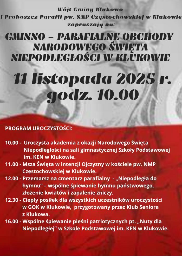 W Klukowie gminno-parafialne obchody Narodowego Święta Niepodległości rozpoczną się o godz. 10:00 uroczystą akademią na sali gimnastycznej SP w Klukowie. O godz. 11:00 odbędzie się msza święta z intencji Ojczyzny w kościele pw. NMP Częstochowskiej, a po liturgii zebrani przejdą na cmentarz parafialny, by wspólnie odśpiewać hymn, złożyć kwiaty oraz zapalić znicze. Po uroczystościach zaplanowano ciepły posiłek dla wszystkich uczestników przygotowany przez Klub Seniora, a o godz. 16:00 - wspólne śpiewanie pieśni patriotycznych w SP w Klukowie.