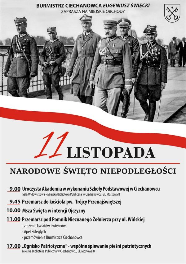 W Ciechanowcu obchody 107. rocznicy odzyskania przez Polskę niepodległości rozpoczną się Uroczystą Akademią w sali widowiskowej Miejskiej Biblioteki Publicznej w Ciechanowcu.
