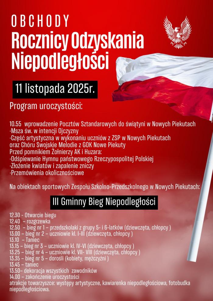 Obchody 107. rocznicy odzyskania niepodległości w Nowych Piekutach rozpoczną się o godz. 10:55.