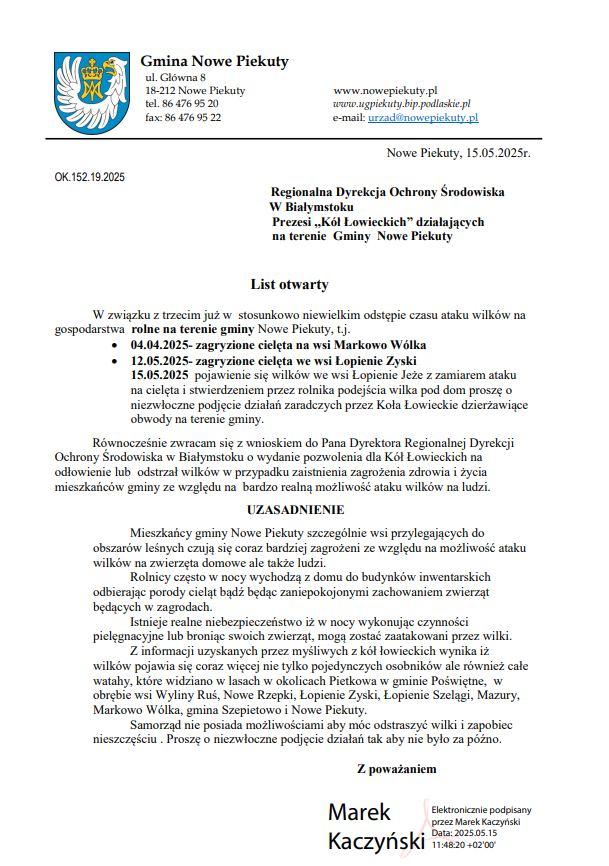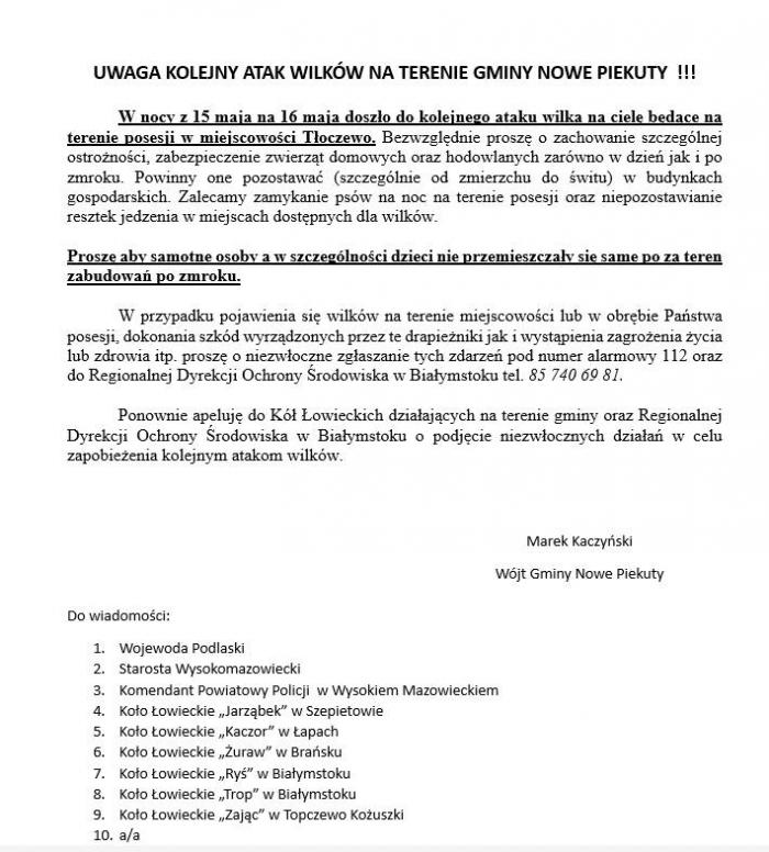 Warto dodać, że wczoraj Wójt Gminy Nowe Piekuty wystosował list otwarty, w którym poinformował o wniosku do Dyrektora Regionalnej Dyrekcji Ochrony Środowiska w Białymstoku „o wydanie pozwolenia dla Kół Łowieckich na odłowienie lub odstrzał wilków w przypadku zaistnienia zagrożenia zdrowia i życia mieszkańców gminy ze względu na bardzo realną możliwość ataku wilków na ludzi”.