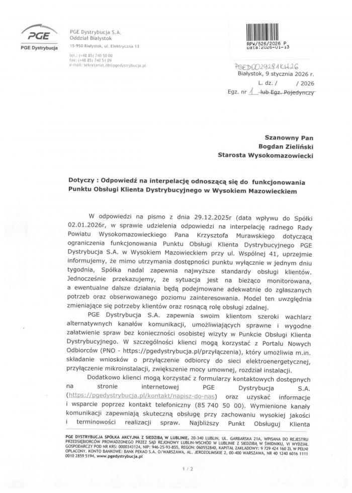 Przypomnijmy, że interpelacja radnego Krzysztofa Murawskiego dotyczyła ograniczenia pracy Punktu Obsługi Klienta Dystrybucyjnego PGE w Wysokiem Mazowieckiem do jednego dnia w tygodniu – środy. Radny, powołując się na liczne sygnały od mieszkańców, pytał m.in., czy zmiana ma charakter stały czy czasowy oraz czy jedyną placówką właściwą dla mieszkańców powiatu pozostaje punkt w Bielsku Podlaskim, z którym – jak podkreślał – Wysokie Mazowieckie nie ma nawet bezpośredniego połączenia komunikacją publiczną.