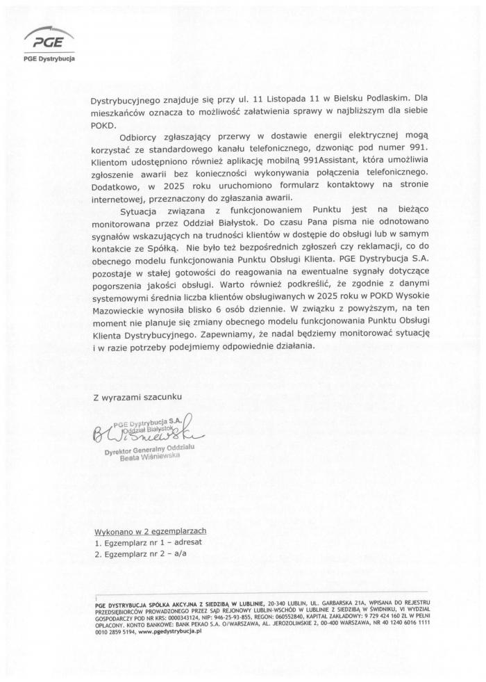 PGE Dystrybucja poinformowała również, że najbliższy Punkt Obsługi Klienta Dystrybucyjnego znajduje się w Bielsku Podlaskim przy ul. 11 Listopada 11. Spółka zaznacza, że mieszkańcy mogą tam załatwiać swoje sprawy osobiście.
