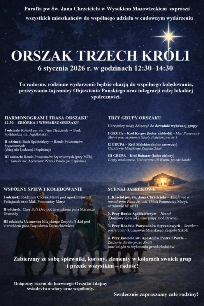 Organizatorem orszaku jest Parafia pw. Św. Jana Chrzciciela w Wysokiem Mazowieckiem, która zaprasza wszystkich mieszkańców – dzieci, młodzież, dorosłych i seniorów – do wspólnego kolędowania i modlitwy. Orszak, nawiązujący do tradycji i historii Trzech Mędrców ze Wschodu, ma charakter otwarty i barwny, a jego uczestnicy będą mogli dołączyć do jednej z trzech grup symbolizujących królów: Kacpra, Melchiora i Baltazara.