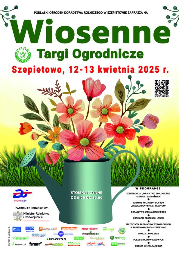 Tegoroczna edycja Wiosennych Targów Ogrodniczych organizowanych przez Podlaski Ośrodek Doradztwa Rolniczego w Szepietowie odbędzie się 12 i 13 kwietnia. Wśród szerokiego asortymentu od wystawców z całego kraju, będzie można wybierać rośliny ogrodowe, krzewy, kwiaty, ozdobny materiał szkółkarski, narzędzia ogrodnicze oraz małą architekturę ogrodową. Na terenach wystawowych pojawi się wielu producentów i sprzedawców, którzy chętnie podzielą się swoją wiedzą i doświadczeniami w zakresie pielęgnacji roślin.