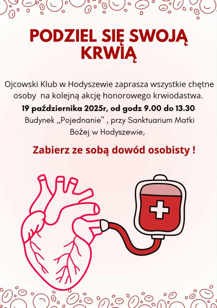 Ojcowski Klub w Hodyszewie zaprasza wszystkich chętnych do udziału w akcji honorowego krwiodawstwa. Wydarzenie odbędzie się 19 października 2025 roku w godzinach od 9:00 do 13:30 w budynku „Pojednanie” przy Sanktuarium Matki Bożej w Hodyszewie.