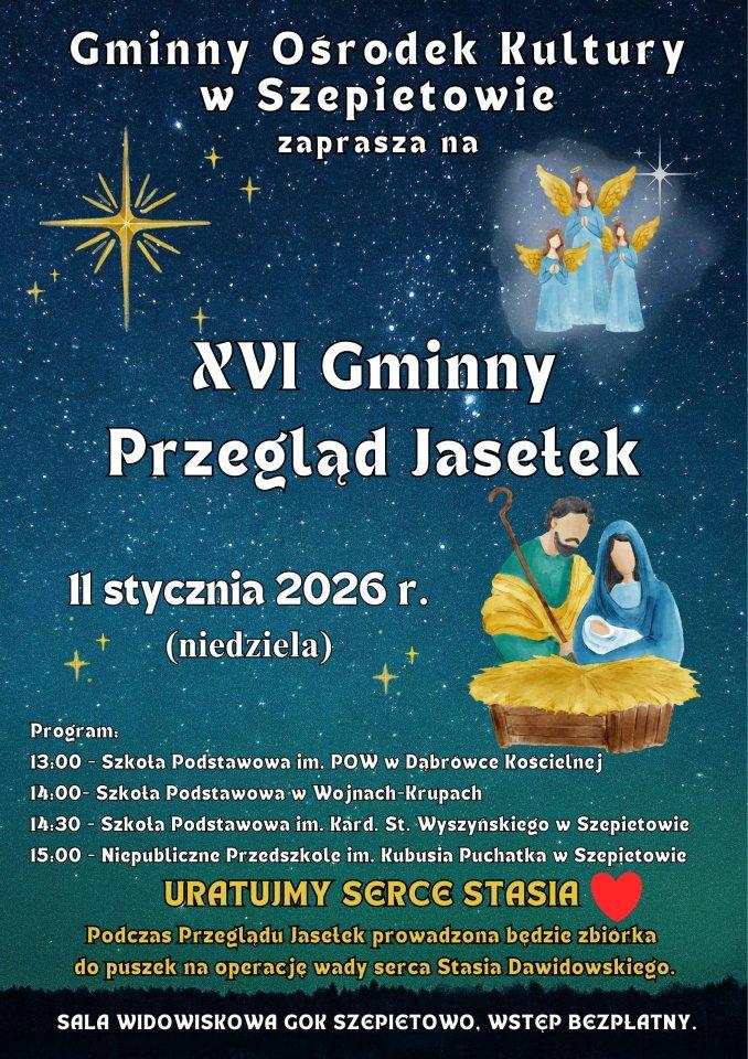 Gminny Ośrodek Kultury w Szepietowie zaprasza na XVI Gminny Przegląd Jasełek, który odbędzie się 11 stycznia 2026 roku od godz. 13:00 na scenie szepietowskiego ośrodka kultury.