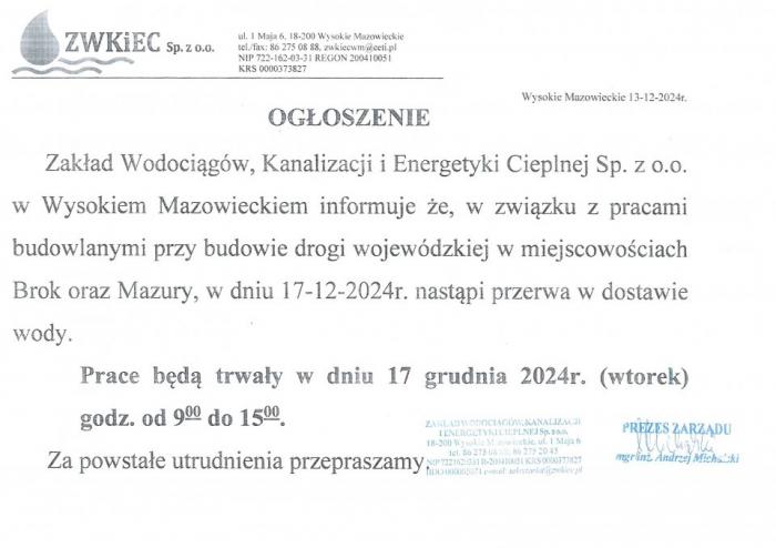Zakład Wodociągów, Kanalizacji i Energetyki Cieplnej Sp. z o.o. w Wysokiem Mazowieckiem informuje, że w związku z pracami budowlanymi przy budowie drogi wojewódzkiej w miejscowościach Brok oraz Mazury (gm. Wysokie Mazowieckie) w dniu 17 grudnia br. (wtorek) w godz. 9:00 - 15:00 nastąpi przerwa w dostawie wody.