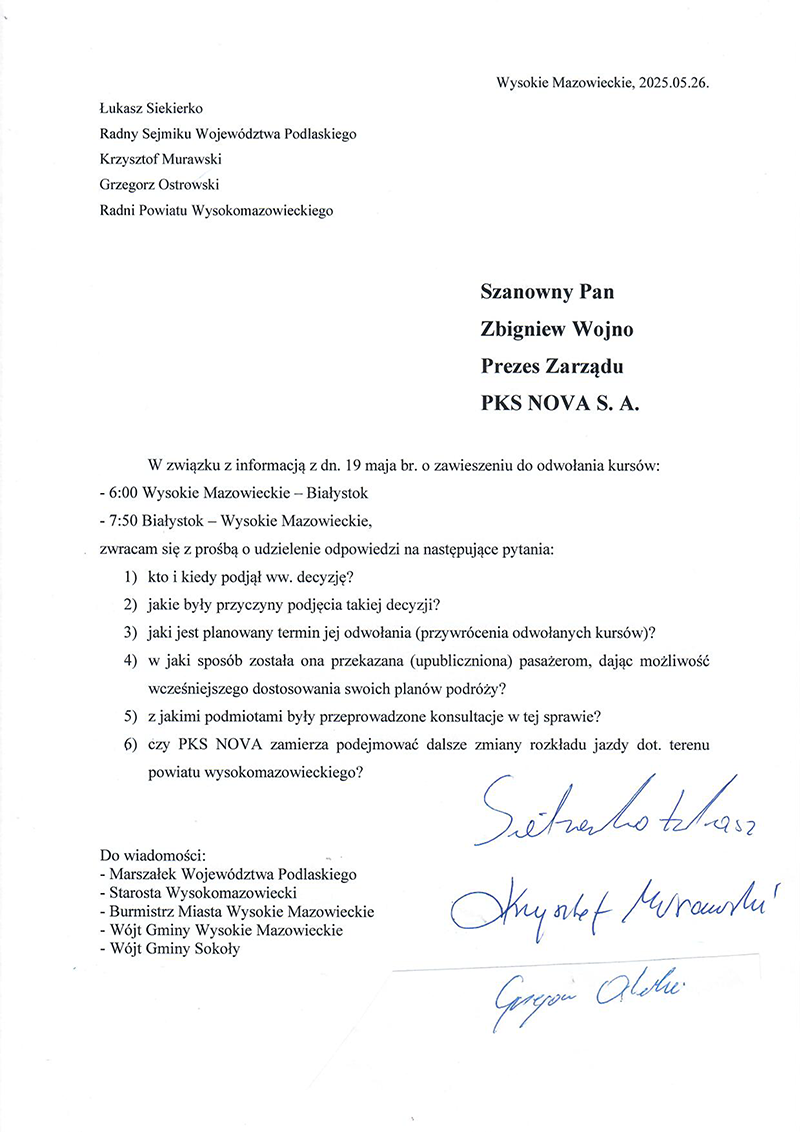Zawieszenie dwóch porannych kursów PKS Nova między Wysokiem Mazowieckiem a Białymstokiem wywołało reakcję lokalnych radnych. Łukasz Siekierko, Krzysztof Murawski i Grzegorz Ostrowski wystosowali pismo do prezesa spółki z pytaniami o powody decyzji i możliwy termin przywrócenia połączeń.