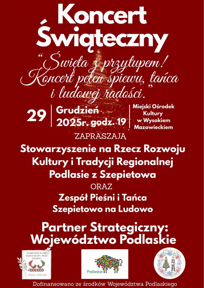 Miejski Ośrodek Kultury w Wysokiem Mazowieckiem zaprasza mieszkańców i gości na niezwykłe muzyczne spotkanie, które idealnie zwieńczy świąteczny czas. Już 29 grudnia 2025 roku o godz. 19:00 odbędzie się koncert pt. „Święta z przytupem! Koncert pełen śpiewu, tańca i ludowej radości”.