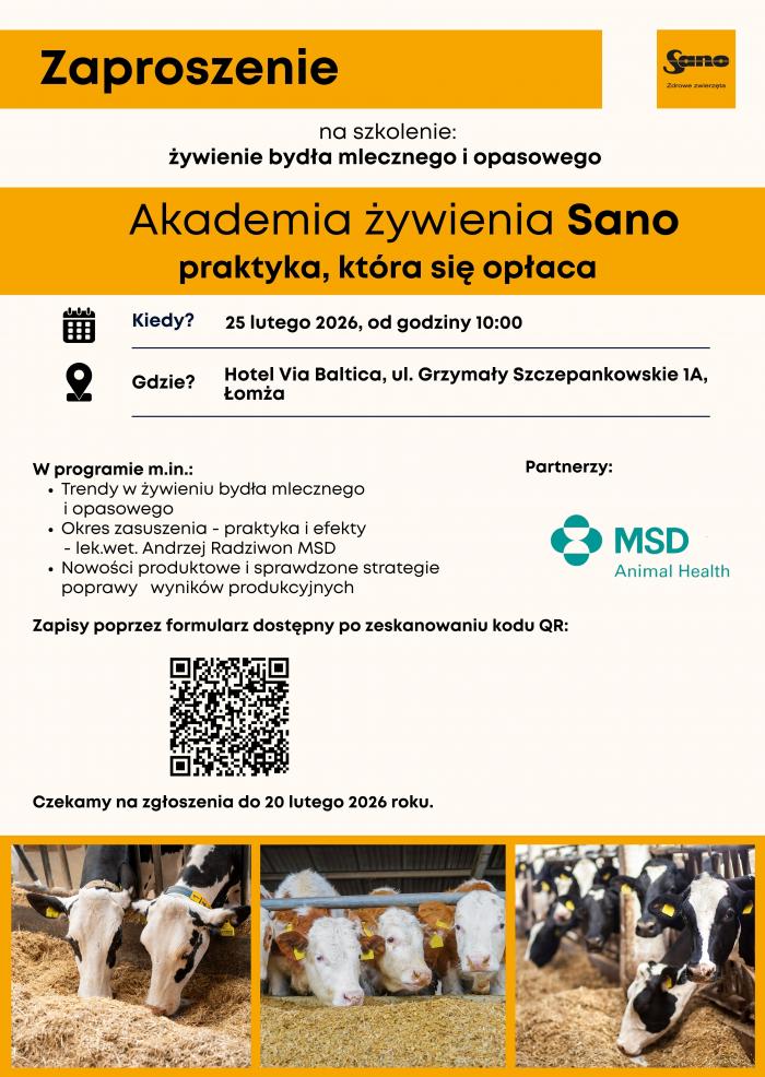 Jak utrzymać wydajność i zdrowotność stada, gdy ceny mleka mocno się wahają? TRANS-ROL zaprasza hodowców bydła mlecznego na szkolenie „Akademia żywienia Sano – praktyka, która się opłaca”. Spotkanie odbędzie się 25 lutego w Łomży.
