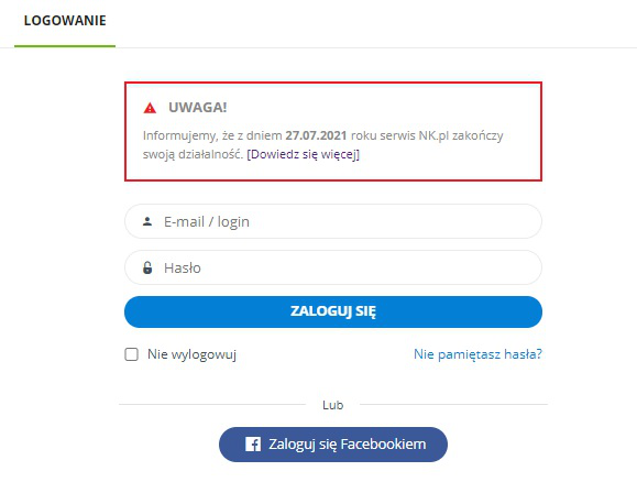 W ogłoszeniu czytamy: „Informujemy, że z dniem 27.07.2021 roku serwis NK.pl zakończy swoją działalność". W praktyce to oznacza, że od wczoraj nie można już założyć nowego konta w serwisie. Użytkownicy, którzy mają wykupione dodatkowe usługi płatne NK.pl mogą z nich korzystać jeszcze dwa miesiące lub złożyć wniosek o zwrot środków.