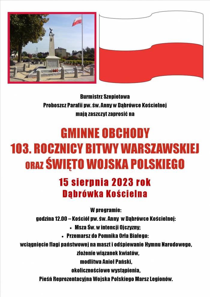Burmistrz Szepietowa oraz proboszcz parafii pw. św. Anny w Dąbrówce Kościelnej zapraszają na Gminny Obchody 103. rocznicy Bitwy Warszawskiej oraz Święto Wojska Polskiego. Uroczystości odbędą się we wtorek, 15 sierpnia i rozpocznie je msza św. w kościele w Dąbrówce Kościelnej o godz. 12:00. Po liturgii zgromadzeni przejdą pod pomnik Orła Białego, gdzie nastąpi złożenie kwiatów i okolicznościowe przemówienia.
