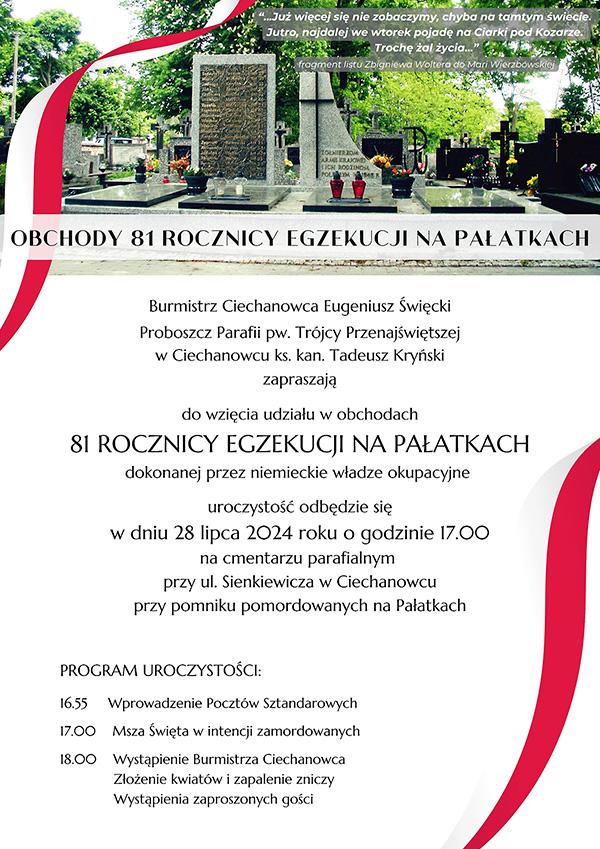 W niedzielę, 28 lipca w Ciechanowcu odbędą się obchody 81. rocznicy egzekucji na Pałatkach dokonanej przez niemieckie władze okupacyjne. Wydarzenie będzie miało miejsce o godz. 17:00 na cmentarzu parafialnym przy ulicy Sienkiewicza przy pomniku pomordowanych na Pałatkach. Odprawiona zostanie msza święta, złożone będą kwiaty oraz zapalone znicze ku pamięci poległych.