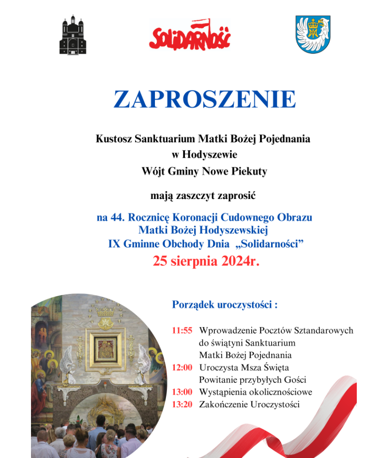 W niedzielę, 25 sierpnia odbędą się uroczystości z okazji 44. Rocznicy Koronacji Cudownego Obrazu Matki Bożej Hodyszewskiej oraz IX Gminne Obchody Dnia "Solidarności".