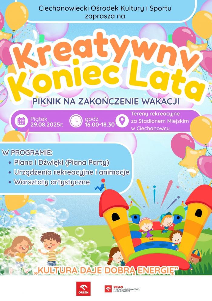 Ciechanowiecki Ośrodek Kultury i Sportu zaprasza na piknik na zakończenie wakacji "Kreatywny Koniec Lata" w godz. 16:00–18:30 na terenach rekreacyjnych za Stadionem Miejskim w Ciechanowcu.
