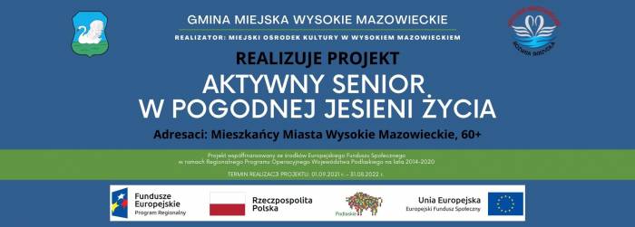 Gmina Miejska Wysokie Mazowieckie realizuje Projekt AKTYWNY SENIOR W POGODNEJ JESIENI ŻYCIA współfinansowany ze środków Europejskiego Funduszu Społecznego w ramach Regionalnego Programu Operacyjnego Województwa Podlaskiego na lata 2014 – 2020 Osi Priorytetowej IX, Rozwój Lokalny. Działanie 9.1 Rewitalizacja społeczna i kształtowanie kapitału społecznego.