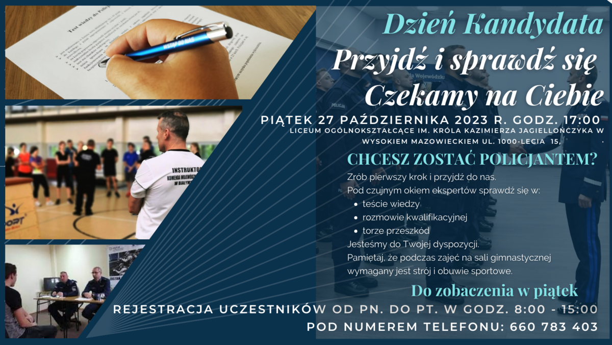 Dzień Kandydata odbędzie się w piątek, 27 października o godz. 17:00 w Liceum Ogólnokształcącym im. Króla Kazimierza Jagiellończyka w Wysokiem Mazowieckiem. Aby wziąć udział w spotkaniu, należy się zarejestrować telefonicznie pod nr 660 783 403 od pn. do pt. w godz. 8:00 - 15:00.